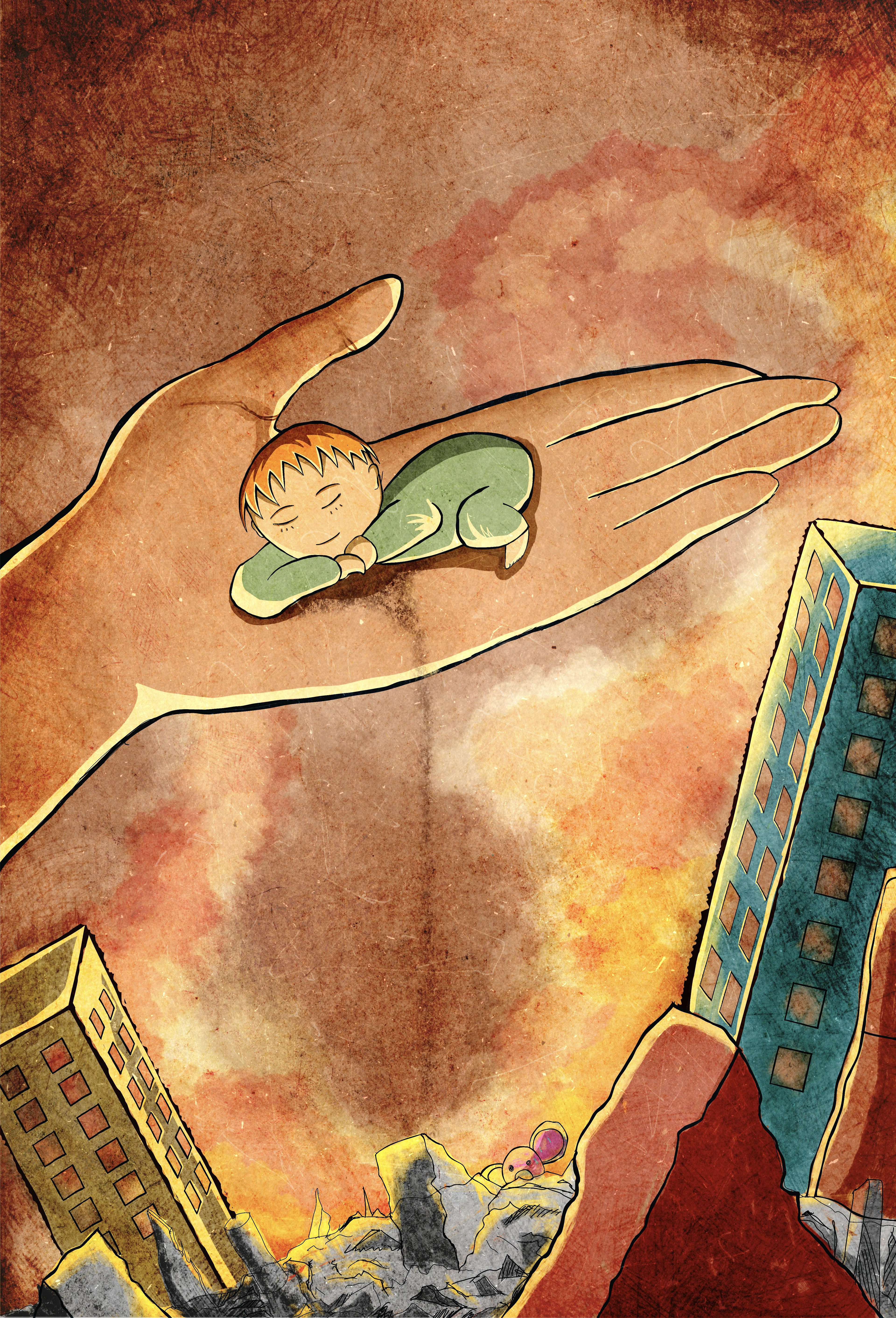 "Regarding the artwork, I was inspired by a news story about a 7 years old sister covered brother's head to protect him when both were under collapsed building. In the artwork, I didn't draw the sister but the hand holding the child represents the sister as well as the individuals who have sacrificed themselves for the sake of earthquake victims."